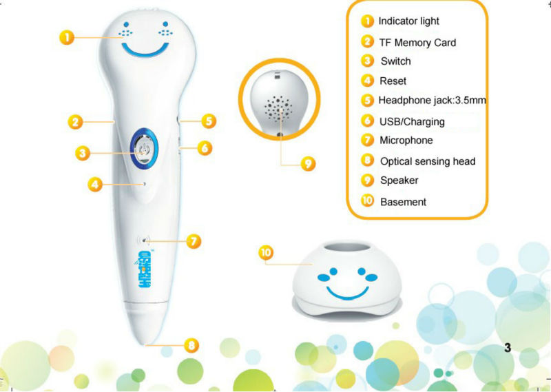 Main function: 1.Point to read 2.Repeat 3.Record 4.Translation 5.MP3 player 6.Select songs 7.Page-turning 8.Listening with earphone or external device
