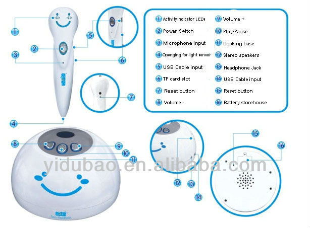 | Features | 1. Cute appearance: Cute design with different color, and using non-toxic, tasteless, non- radioactive safety and environmental protection material. 2. Book selection function: Book arbitrary choice of the machine, different learning content unlimited switching and adds learning fun. 3. Recording function: Children can keep a diary by talking to the pen. 4. Music player: supports MP3 format files, point of reading selections, volume adjustable, easy to operate. 5. Large memory storage capacity: 4G oversized machine, can be expand to 8G. 6. U disk function: heart download nursery rhymes nursery rhymes and reading materials in English, USB highspeed download. 7.Automatic shutdown: Standby 5 minutes intelligent automatic shutdown, to assist parents to protect theirchildren’s hearing and save power. 8. Sentence translation: word, statement simultaneous translation, deepen understanding and improvethe English proficiency of a good helper. 9. Pronunciation: high-definition standard Mandarin Soundtrack children sound, that is the point that read intothe infinite joy of learning. 10. Independent Stereo Double-Speaker: high quality stereo sound-box 11. Bluetooth transfer:When you touch a book with the pen, there will be sounds come from the basement. |