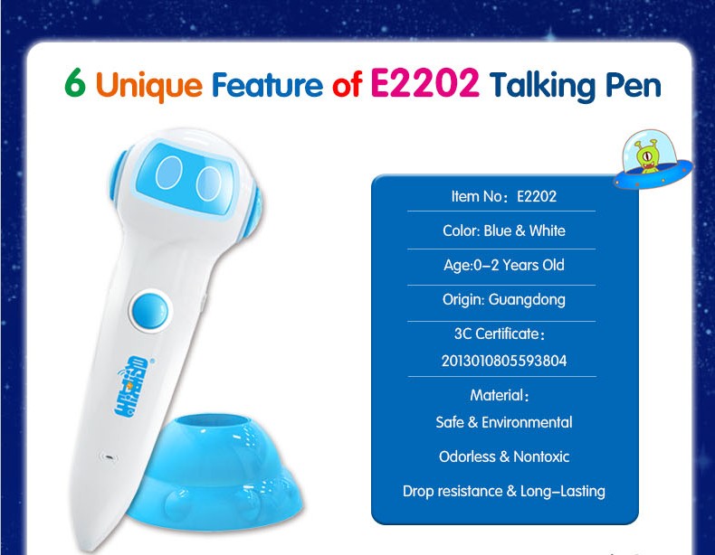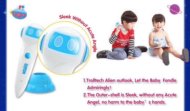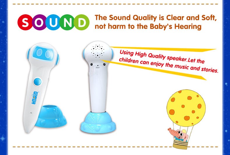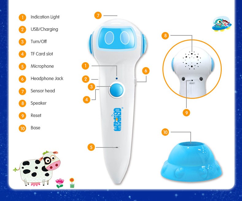 1. Cute appearance: Cute design with different color, and using non-toxic, tasteless, non- radioactive safety and environmental protection material. 2. Book selection function: Book arbitrary choice of the machine, different learning content unlimited switching and adds learning fun. 3. Recording function: Children can keep a diary by talking to the pen. 4. Music player: supports MP3 format files, point of reading selections, volume adjustable, easy to operate. 5. Large memory storage capacity: 4G oversized machine, can be expand to 8G. 6. U disk function: heart download nursery rhymes and reading materials in English,USB highspeed download. 7.Automatic shutdown: Standby 5 minutes intelligent automatic shutdown, to assist parents to protect their children’s hearing and save power. 8. Sentence translation: word, statement simultaneous translation,deepen understanding and improve the English proficiency of a good helper. 9. Pronunciation: high-definition standard Mandarin Soundtrack children sound, that is the point that read into the infinite joy of learning. |