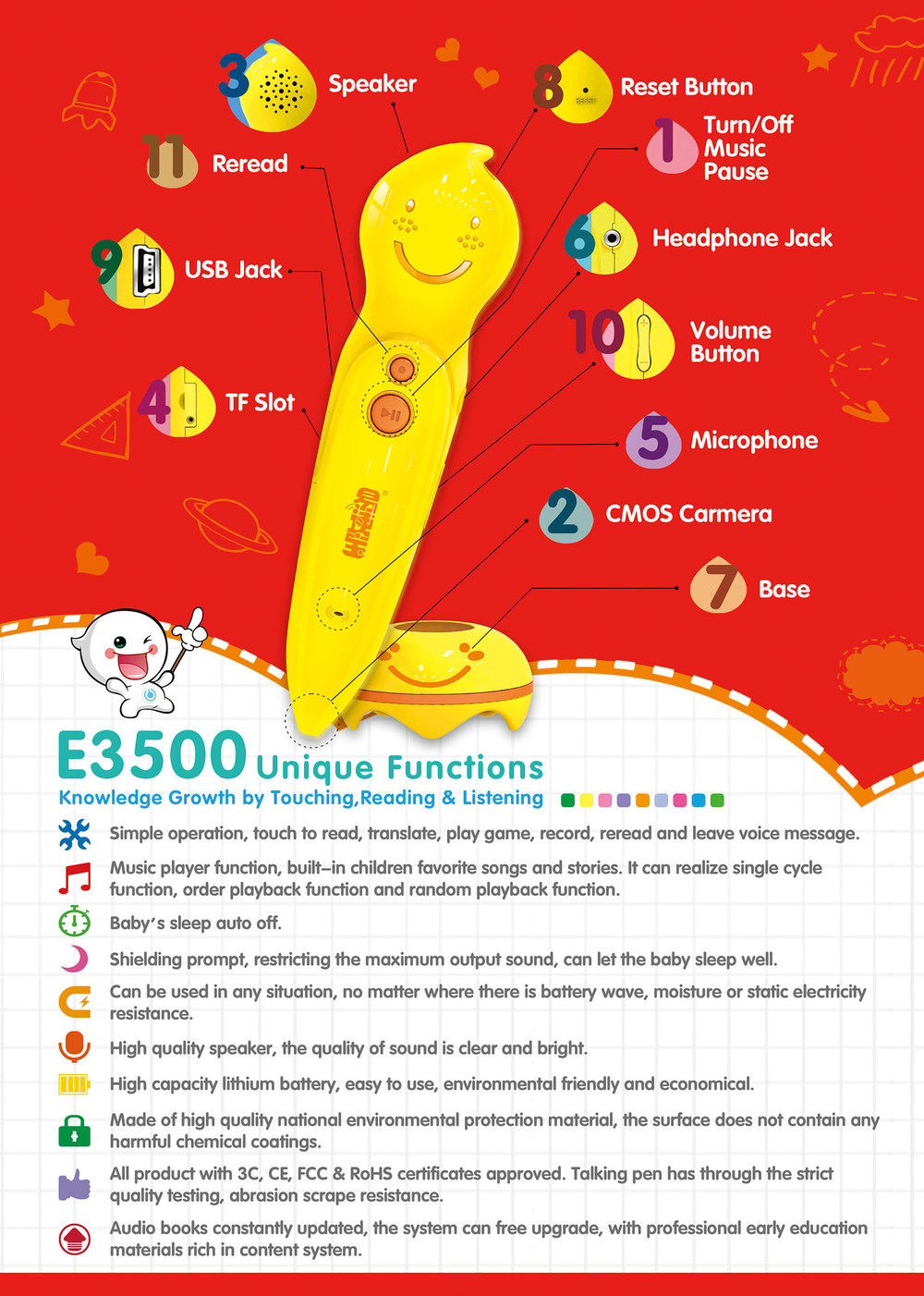 | Features | 1. Cute appearance: Cute design with different color,and using non-toxic,tasteless, non-radioactive safety and environmental protection material. 2. Book selection function: Book arbitrary choice of the machine, different learning content unlimited switching and adds learning fun. 3. Recording function: Children can keep a diary by talking to the pen. 4. Music player: supports MP3 format files, point of reading selections, volume adjustable, easy to operate. 5. Large memory storage capacity: 4G oversized machine, can be expand to 8G. 6. U disk function: heart download nursery rhymes and reading materials in English, USB highspeed download. 7.Automatic shutdown: Standby 5 minutes intelligent automatic shutdown, to assist parents to protect theirchildren’s hearing and save power. 8. Sentence translation: word, statement simultaneous translation, deepen understanding and improve the English proficiency of a good helper. 9. Pronunciation: high-definition standard Mandarin Soundtrack children sound, that is the point that read into the infinite joy of learning. |
