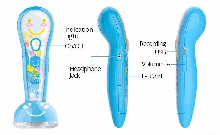 | Features | 1. Cute appearance: Cute design with different color, and using non-toxic, tasteless, non- radioactive safety and environmental protection material. 2. Book selection function: Book arbitrary choice of the machine, different learning content unlimited switching and adds learning fun. 3. Recording function: Children can keep a diary by talking to the pen. 4. Music player: supports MP3 format files, point of reading selections, volume adjustable, easy to operate. 5. Large memory storage capacity: 4G oversized machine, can be expand to 8G. 6. U disk function: heart download nursery rhymes nursery rhymes and reading materials in English, USB highspeed download. 7.Automatic shutdown: Standby 5 minutes intelligent automatic shutdown, to assist parents to protect theirchildren’s hearing and save power. 8. Sentence translation: word, statement simultaneous translation, deepen understanding and improvethe English proficiency of a good helper. 9. Pronunciation: high-definition standard Mandarin Soundtrack children sound, that is the point that read intothe infinite joy of learning. 10.Changeable pen shell |