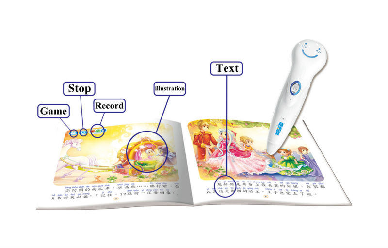 Main function: 1.Point to read 2.Repeat 3.Record 4.Translation 5.MP3 player 6.Select songs 7.Page-turning 8.Listening with earphone or external device