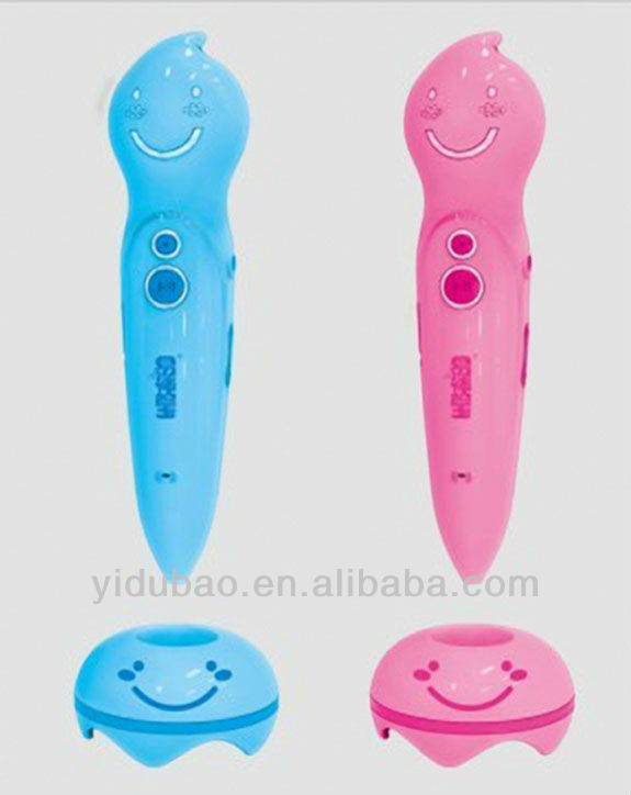 | Features | 1. Cute appearance: Cute design with different color, and using non-toxic, tasteless, non- radioactive safety and environmental protection material. 2. Book selection function: Book arbitrary choice of the machine, different learning content unlimited switching and adds learning fun. 3. Recording function: Children can keep a diary by talking to the pen. 4. Music player: supports MP3 format files, point of reading selections, volume adjustable, easy to operate. 5. Large memory storage capacity: 4G oversized machine, can be expand to 8G. 6. U disk function: heart download nursery rhymes nursery rhymes and reading materials in English, USB highspeed download. 7.Automatic shutdown: Standby 5 minutes intelligent automatic shutdown, to assist parents to protect theirchildren’s hearing and save power. 8. Sentence translation: word, statement simultaneous translation, deepen understanding and improvethe English proficiency of a good helper. 9. Pronunciation: high-definition standard Mandarin Soundtrack children sound, that is the point that read intothe infinite joy of learning. |