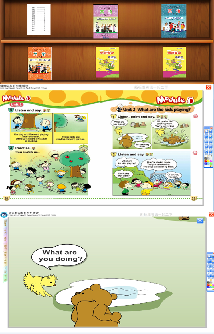 We have the special teaching assistant for teachers to prepare the class. Different resources like MP3, video, PPT, flash, internet links can be built into the software. And questions and practice can be made. It will play when we touch the parts.