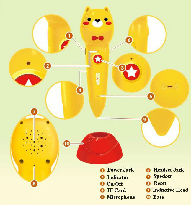 Main function: 1.Point to read 2.Repeat 3.Record 4.Translation 5.MP3 player 6.Select songs 7.Page-turning 8.Listening with earphone or external device