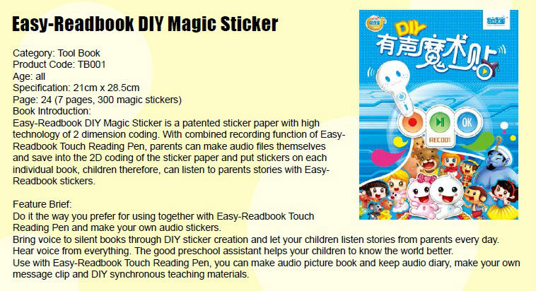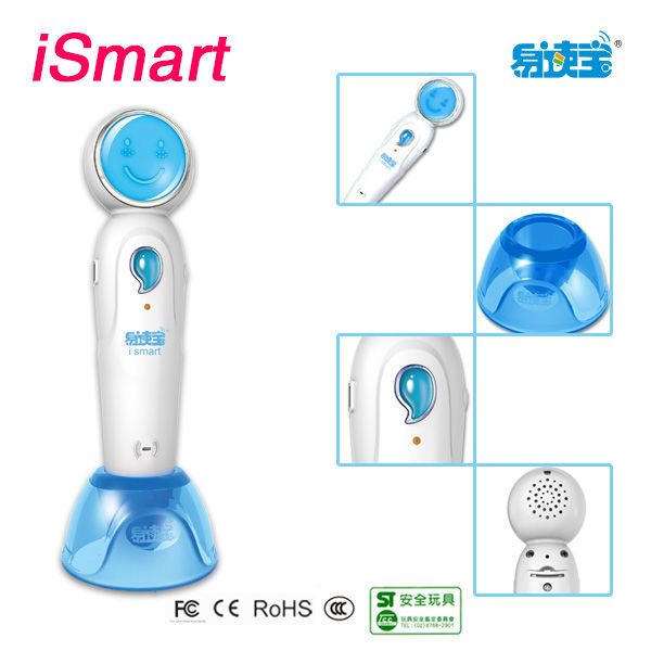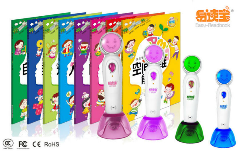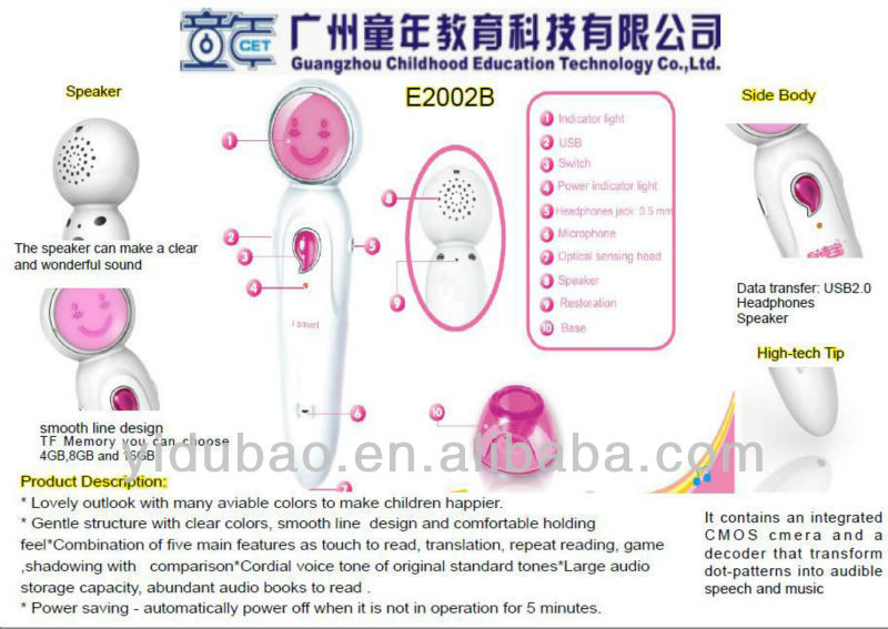 | 1.Cute appearance: Cute designwith different color, and using non-toxic, tasteless, non- radioactive safety and environmental protection material. 2.Book selection function: Book arbitrary choice of the machine, different learning content unlimited switching and adds learning fun. 3.Recording function: Children can keep a diary by talking to the pen. 4.Music player: supports MP3 format files, point of reading selections, volume adjustable, easy to operate. 5.Large memory storage capacity: 4 GB or 8GB Memory Card for your choice. 6.Download function: Heart download nursery rhymes nursery rhymes and reading materials in English,USB high speed download. 7.Automatic shutdown: Standby 5 minutes intelligent automatic shutdown, to assist parents to protect their children’s hearing and save power. 8.Sentence translation: word, statement simultaneous translation, deepen understanding and improve the English proficiency of a good helper. 9.Pronunciation: high-definition standard Mandarin Soundtrack children sound, that is the point that read into the infinite joy of learning. | |||||||