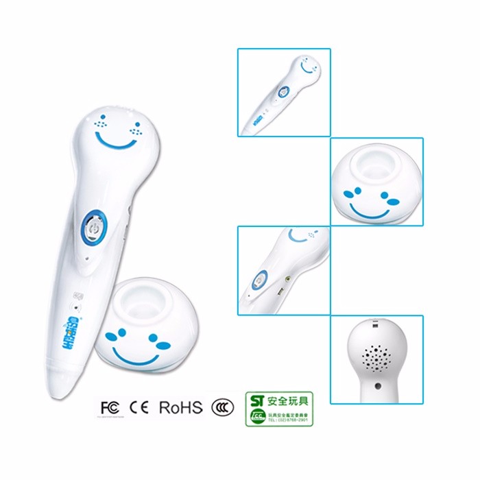 1. Cute appearance: Cute design with different color, and using non-toxic, tasteless, non- radioactive safety and environmental protection material. 2. Book selection function: Book arbitrary choice of the machine, different learning content unlimited switching and adds learning fun. 3. Recording function: Children can keep a diary by talking to the pen. 4. Music player: supports MP3 format files, point of reading selections, volume adjustable, easy to operate. 5. Large memory storage capacity: 4G oversized machine, can be expand to 8G. 6. U disk function: heart download nursery rhymes nursery rhymes and reading materials in English, USB highspeed download. 7.Automatic shutdown: Standby 5 minutes intelligent automatic shutdown, to assist parents to protect theirchildren’s hearing and save power. 8. Sentence translation: word, statement simultaneous translation, deepen understanding and improvethe English proficiency of a good helper. 9. Pronunciation: high-definition standard Mandarin Soundtrack children sound, that is the point that read intothe infinite joy of learning. |