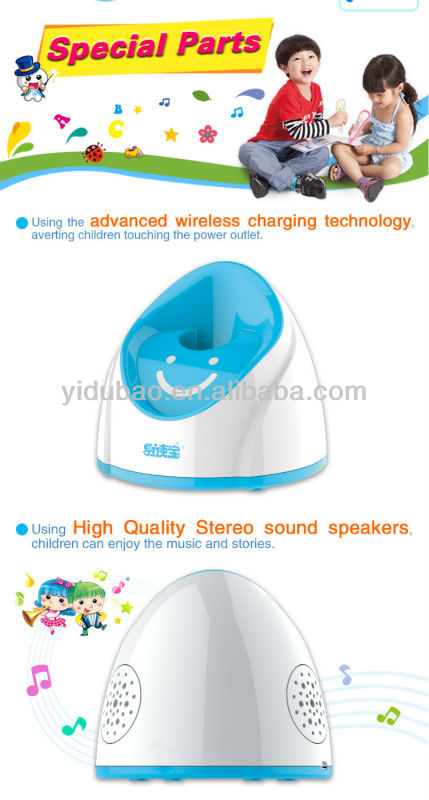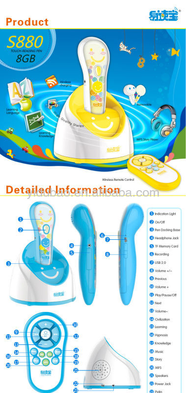 1. Cute appearance: Cute design with different color, and using non-toxic, tasteless, non- radioactive safety and environmental protection material. 2. Book selection function: Book arbitrary choice of the machine, different learning content unlimited switching and adds learning fun. 3. Recording function: Children can keep a diary by talking to the pen. 4. Music player: supports MP3 format files, point of reading selections, volume adjustable, easy to operate. 5. Large memory storage capacity: 4G oversized machine, can be expand to 8G. 6. U disk function: heart download nursery rhymes nursery rhymes and reading materials in English, USB highspeed download. 7.Automatic shutdown: Standby 5 minutes intelligent automatic shutdown, to assist parents to protect theirchildren’s hearing and save power. 8. Sentence translation: word, statement simultaneous translation, deepen understanding and improvethe English proficiency of a good helper. 9. Pronunciation: high-definition standard Mandarin Soundtrack children sound, that is the point that read intothe infinite joy of learning. 10.Changeable pen shell 11. independent stereo double-speaker |